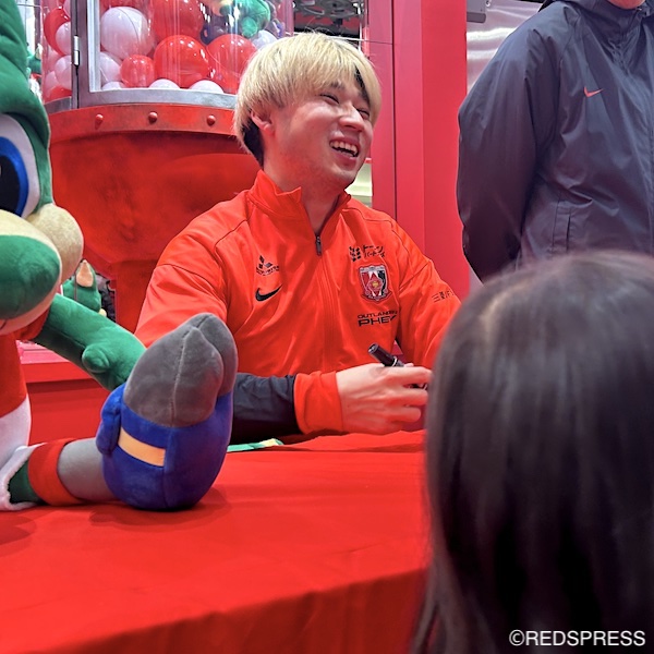 大きな声で挨拶し、笑顔でサポーター1人1人を迎えた松尾佑介。春分の日の3月20日(祝・金)、松尾は、イオンモール浦和美園・3階キッズスペース前にある『REDIA FACTORY(レディアファクトリー)』の1日店長を務め、サイン会を開いた。