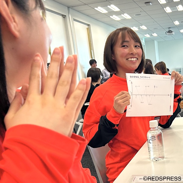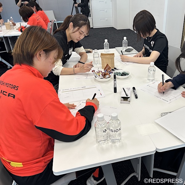 また、三菱重工浦和レッズレディースとは、2024年にALL WE ACTION DAYの取り組みとして、“自分の未来について考える”と題したワークショップを開催。自分の未来やキャリア構築への意識を高める機会となった。この時は、参加した26名の選手が、5グループに分かれ、“10年後の未来を想像する”をテーマにグループディスカッション。未来を考え、今、自分たちは今後、どう過ごしていくかを意識した。