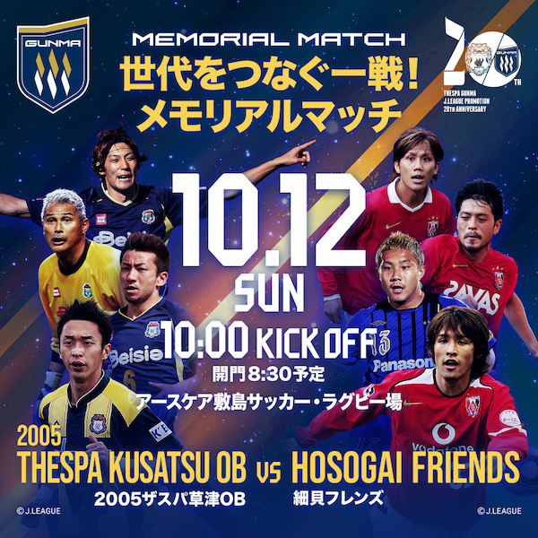 J3リーグ第31節・ヴァンラーレ八戸戦が行われる10月12日(日)は、『ザスパ群馬Jリーグ加盟20周年記〜夢と誇りの物語〜』と題し、イベントが開催される。試合前には、ザスパ群馬がJリーグ加盟当時の【2005ザスパ草津OB】と、細貝社長に縁のある選手たちを招いての【細貝フレンズ】で、メモリアルマッチが開催される。