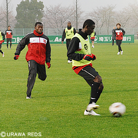 ゲーム練習はタンココーチを加え、8対8からスタート。ミニゴールと正規サイズのゴールを設置し、いくつかのルールのもと、ゴールを狙った。水分補給した後、GKを含めた9対9で再開。ファイサルと国士舘大学戦にも出場したサヌが激しい攻防を見せていた。練習終了後は柏木陽介がフィンケ監督とじっくりと話し合う場面が見られた。