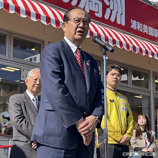 株式会社き?ょうさ?の満洲の池野谷ひろみ代表取締役社長、埼玉高速鉄道株式会社の平野邦彦代表取締役社長、そして建設に携わったウニクス浦和美園を開発、運営する株式会社ヒ?ーアント?テ?ィコンサルティンク?の溝口隆朗代表取締役、さらに『ぎょうざの満洲 浦和美園駅店』のオープンに欠かすことの出来ない存在である卓球・Tリーグ男子のプロチーム『T.T彩たま』から、水野裕哉監督、曽根翔選手が出席した。