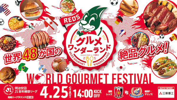中でも、この日、マッチパートナーを務める三菱重工業株式会社のサポートのもと、埼スタ横・大門上池調節池広場にて『REDSグルメワンダーランド supported by 三菱重工 〜世界を食べ尽くせ!ワールドグルメフェス〜』が開催される。10時〜試合終了後の17時まで。