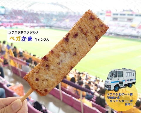 仙台の友人から教えて頂いて、今回行ったらぜひ食べたいと思っているのが、スタグルの「ベガかま」です。ブラックペッパーの利いた牛タン入りかまぼこで、ビールのおつまみに最高とのこと。北ゲート前で開場の約2時間前から、阿部蒲鉾店のキッチンカーで販売しています。10月5日(土)のFC東京戦では普段の倍の本数を用意して、キックオフ1時間前には完売したらしいです。気仙沼サメ肉を使用した「シャークナゲット」も大人気だそうで、一緒にワンコインで買えます。
