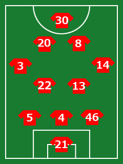 MF:13鈴木啓太・22阿部勇樹・14平川忠亮・3宇賀神友弥・8柏木陽介・20李忠成